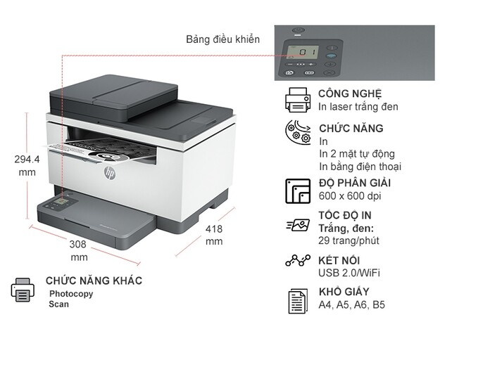 - Loại máy in: In laser trắng đen đa năng (IN-SCAN-COPY) - In qua wifi + đảo mặt tự động
